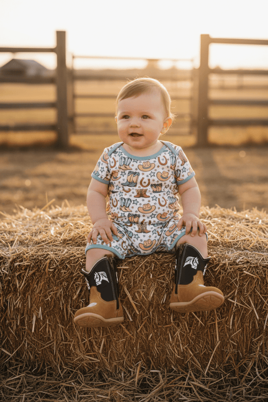 Baby Cowboy Romper | Western Infant Short Sleeve Outfit with Snap Bottom (0-24M)