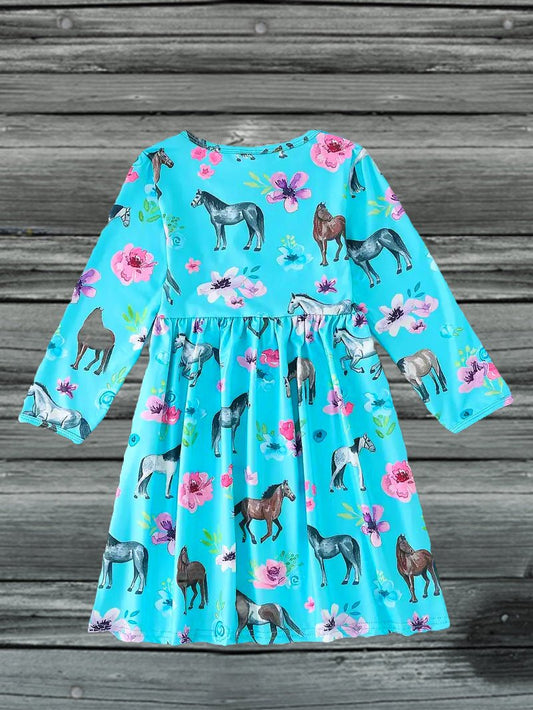 "Gallop & Bloom" Blue Horse Print Long Sleeve Dress