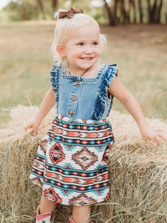 Western Charm Girls Denim & Aztec Cowgirl Dress - Kids Western Outfit