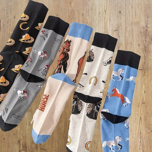 Hoofin' Around Delight: 5 Pairs of Cute Horse Pattern Crew Socks - Western Themed Kids Horse Socks