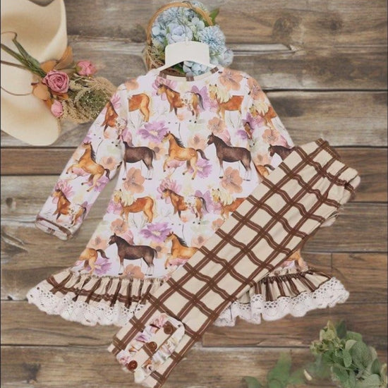 Girl's Countryside Charm Set – Horse & Flower Print Dress with Plaid Lace Pants